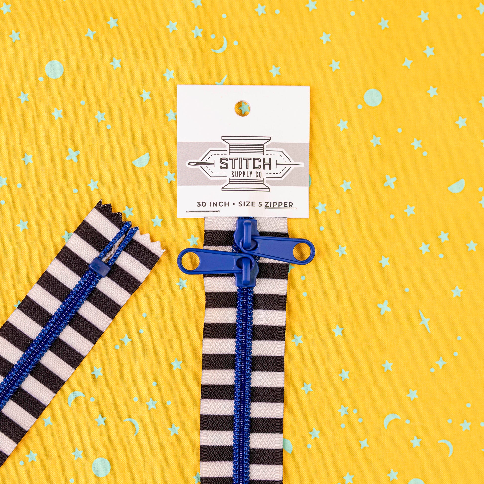 Black and white stripe zipper, 30" long, Size 5, Stoppers on each end with double facing heads. Vinyl teeth with metal zipper heads.