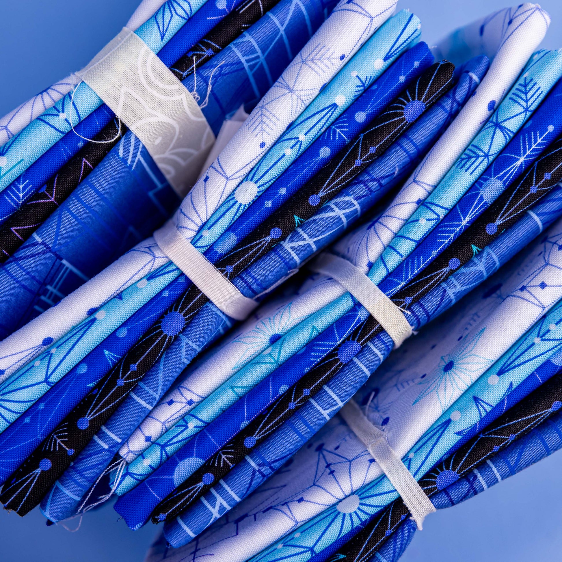 5 fat quarters of modern snowflakes and wintery blues from Guicy Guice will have you singing at the top of your lungs at their curated beauty!
