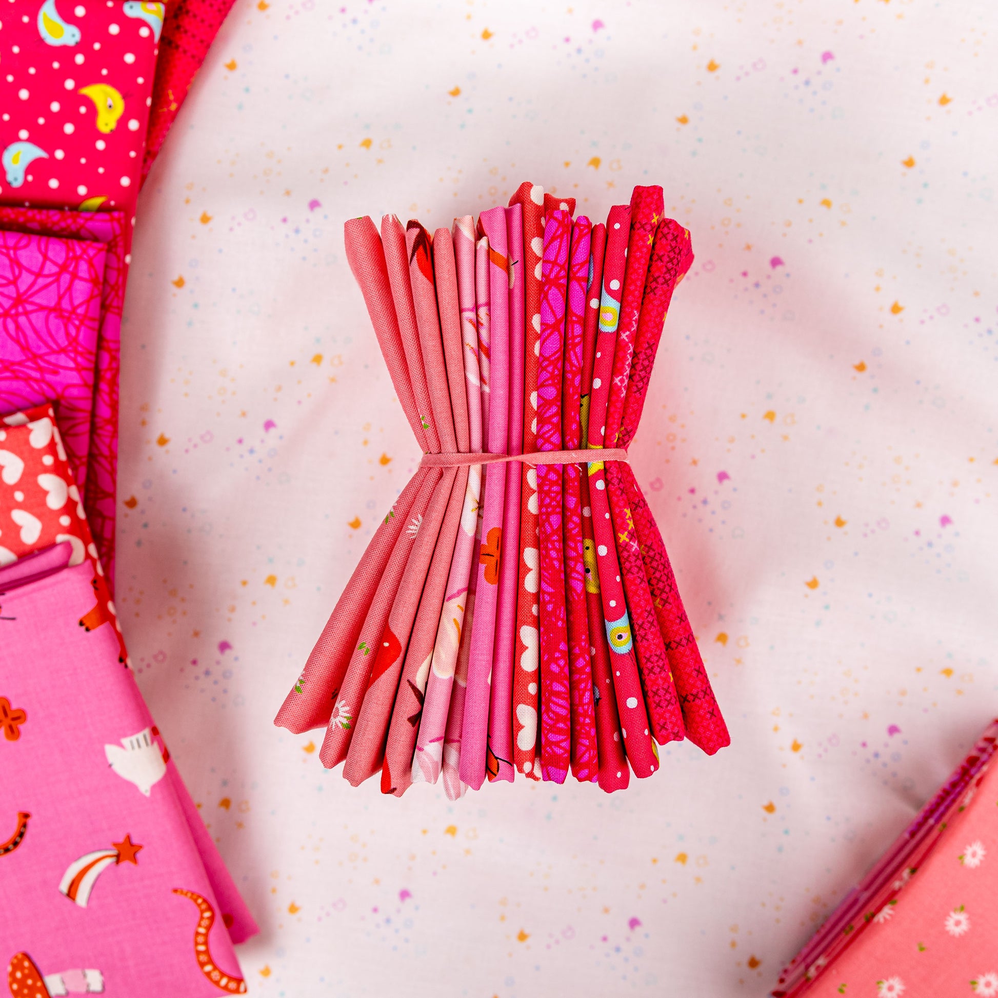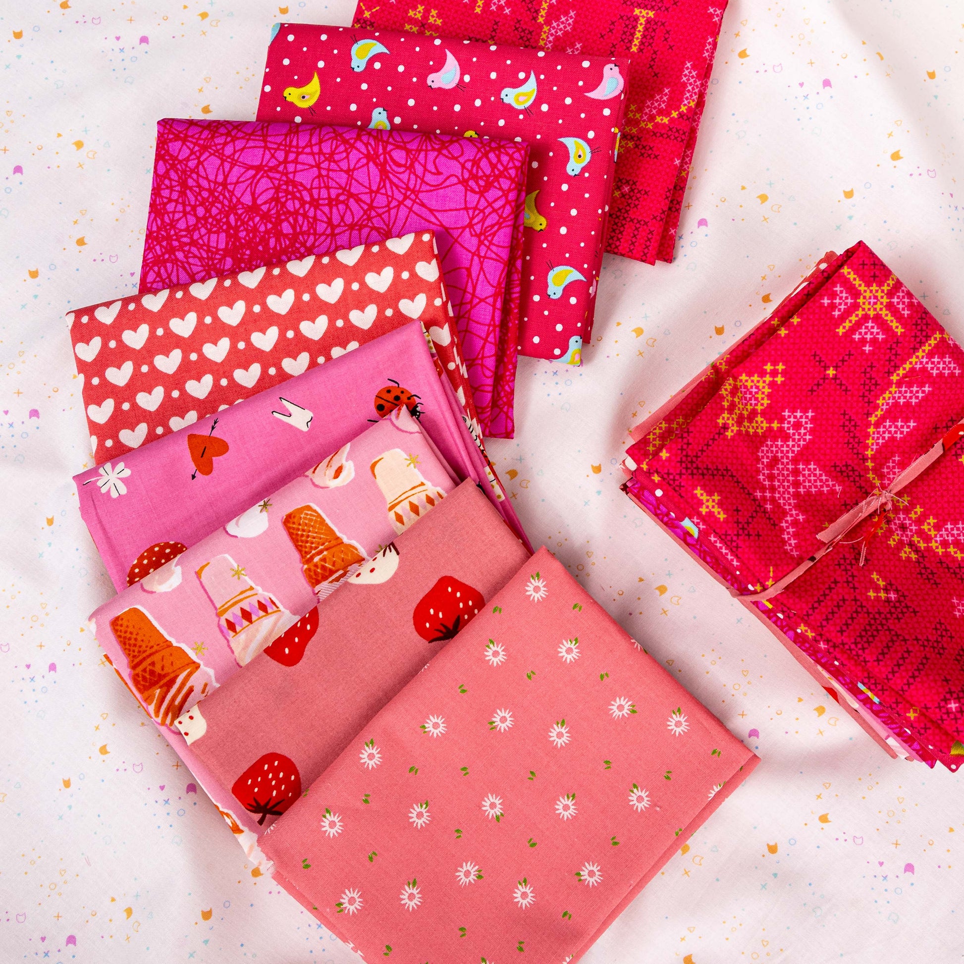 Our curated Sweetheart Bundle includes 8 different sweetheart curated fabrics including fabrics from Ruby Star Society, Sherri and Chelsi, Alison Glass, and Me & My SisterI